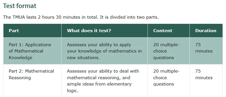TMUA 的全称为 Test of Mathematics for University Admission,是由剑桥与帝国理工联合创办的 UAT-UK 共同设计(2024 年新变更),用于测试申请者的数学学业水平。考试为机考,考试时长是 2 小时 30 分钟,分为知识应用和数学推理两个部分,知识点主要基于 A-Level 课程的 AS 阶段数学内容及部分 GCSE 阶段的数学内容,不允许使用计算器和字典。