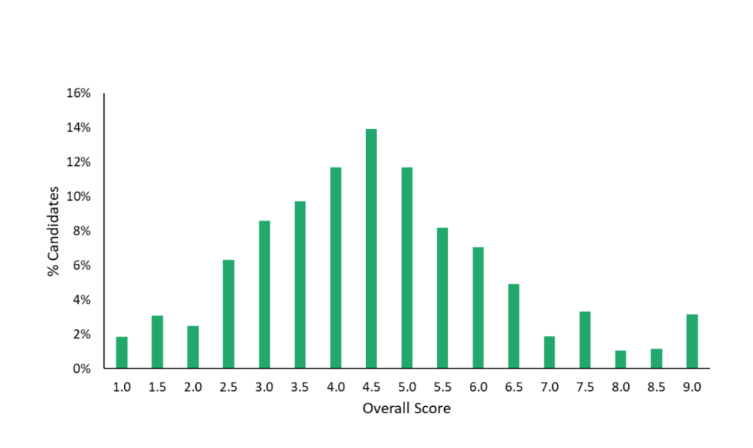 大多数考生的分数集中在 4.0 到 5.5 之间,有 10% 的学生能取得 7 分以上的分数。