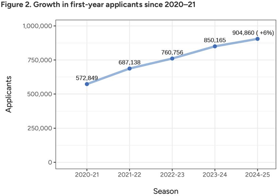 截止11月1日,本申请季(2024-25)在全球范围内共有904,860名学生通过平台向863所会员高校递交了4,017,250份新生入学申请。申请人数和申请量同比分别增长6%和10%。