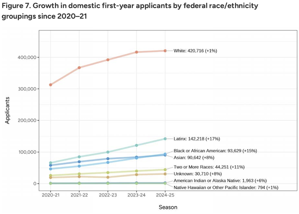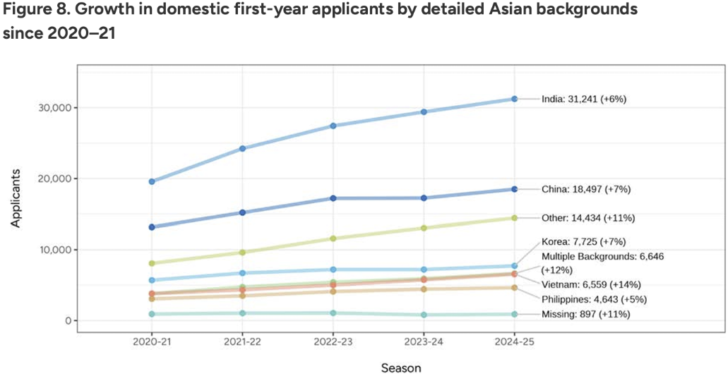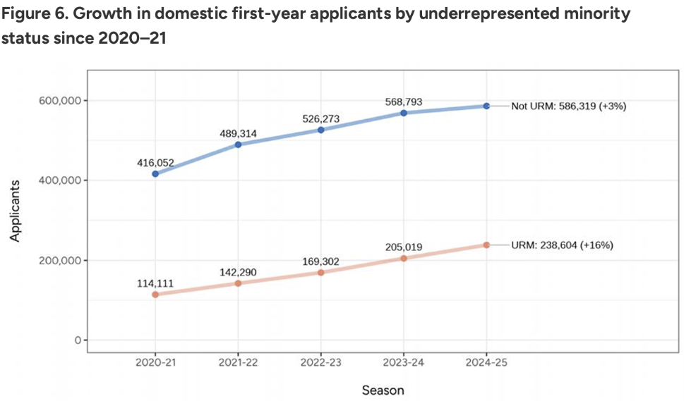 弱势族群申请人数同比飙升16%,显著超过非该群体增幅(3%),表明申请生源在该维度的多样化继续提升。