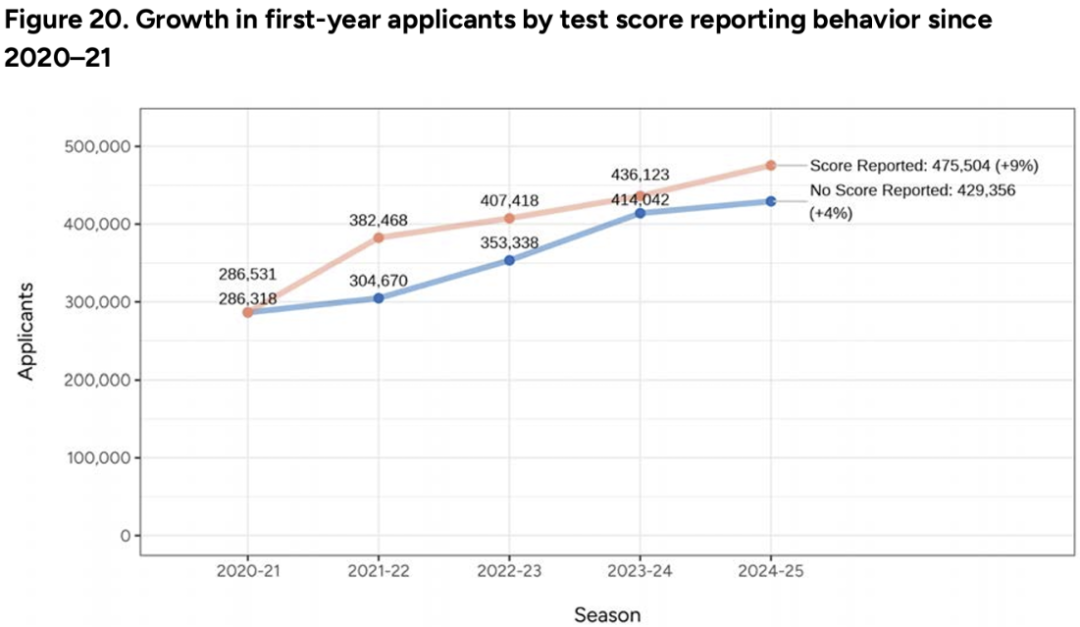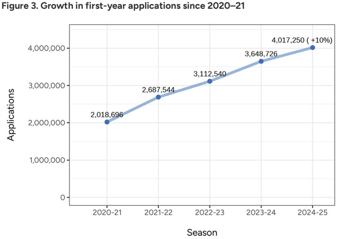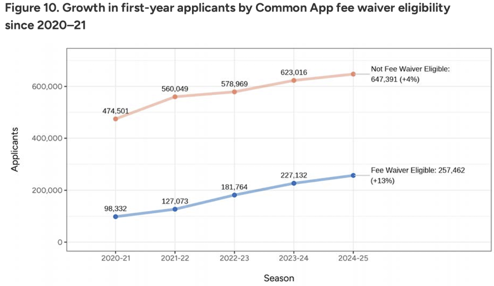 获得申请费豁免资格的申请人数也较2023-24申请季飙升13%,涨幅超过支付申请费的学生数量涨幅(4%)的三倍。