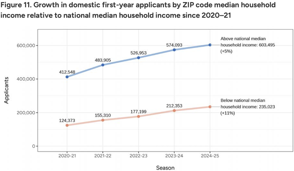 低收入申请量同比增加11%,涨幅较非低收入学生量(5%)翻了超过一番。