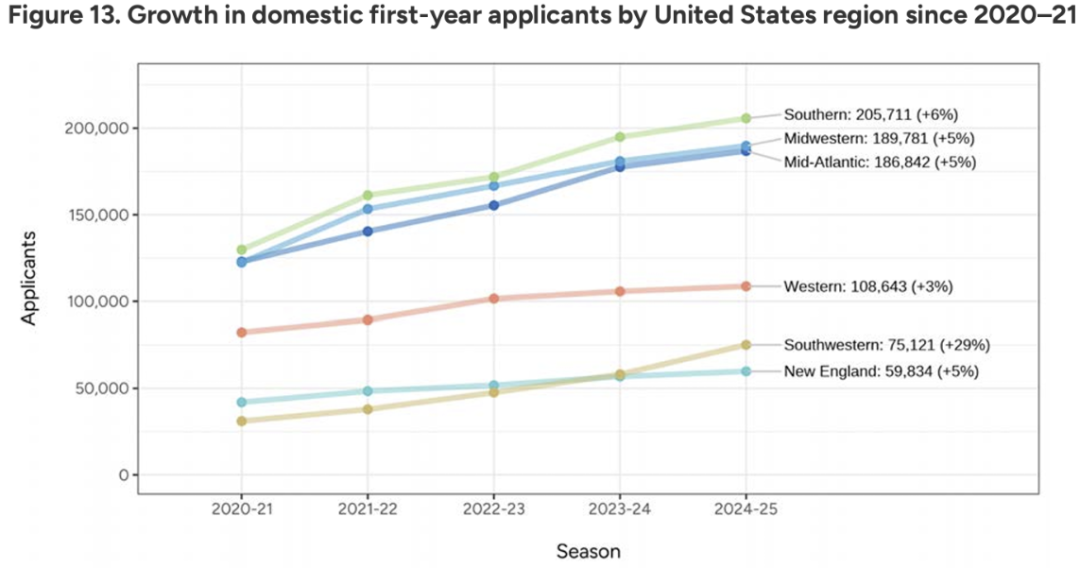 截止11月1日,来自全美各地区的生源同比均有不同幅度的增长。其中,美国西南部和南部地区的本土生源同比增幅最高,依次达到29%和6%,中西部、新英格兰和大西洋中部地区生源增幅均为5%。西部地区只有3%的涨幅。