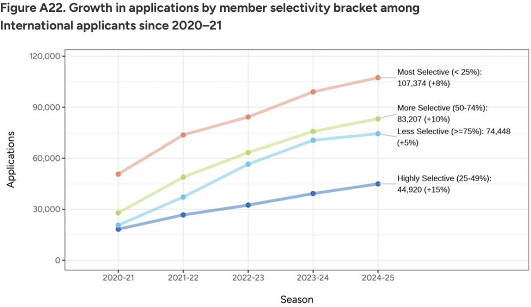 本学年申请量级远超疫情期间的2020-21学年,人均申请量(4.44)比四年前(3.52)和上个申请季(4.29)分别增加26%和3%。