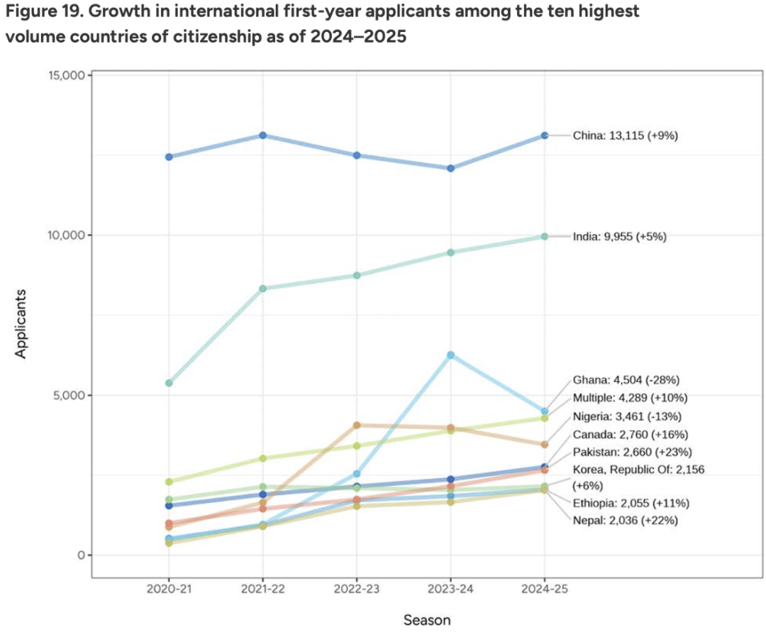 前五大国际生源国依次为中国、印度、加纳、尼日利亚和尼泊尔。虽然本月早些时候发布的《门户开放报告》显示中国最大生源国地位被印度取代,且中国学生份额(25%)大幅落后印度(29%),但在CommonApp上提前递交申请的中国学生人数(13,115)同比上升9%,远超印度(9,955)。