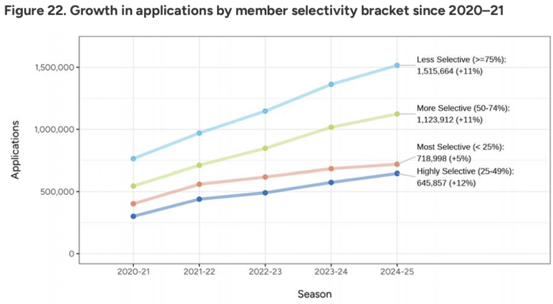 尽管低选拔率院校(录取率不低于50%)收到了最多入学申请(超过150万份),但名校(录取率低于25%)也收到了超过72万份入学申请。该数据对有志于就读名校的学生具有参考价值。